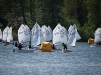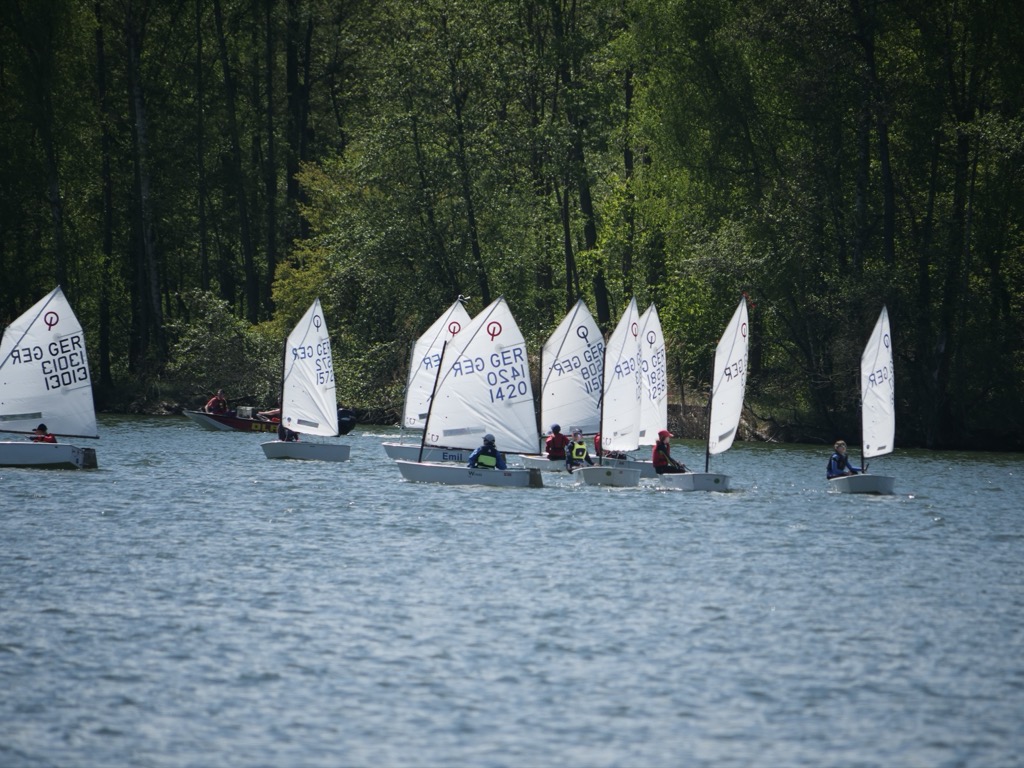 Zur Sache geht es in beiden Regatten, wie auch in Inheiden beeindruckend durch die Kinder gezeigt wurde. Nach einer ersten Reviererkundung am Freitag, startete der erste Lauf der Klasse A bei bestem Wind am Samstag gegen 13 Uhr, fünf Minuten später folgte der Start der Klasse B. Insgesamt drei Läufe konnten in beiden Bootsklassen am Samstag gefahren werden, die Wertungen werden am Ende des Tages zusammengezählt, bevor es üblicherweise am zweiten Tag in die weiteren Läufe geht. Für viele Segler ware es die erste Regatta nach einem intensiven Training und einer Regattateilnahme am italienischen Gardasee in den Osterferien, entsprechend hoch war die Motivation und die Erwartungen der jüngsten Segler, die sich auf die doch oft wechselnden Windverhältnisse am Inheidener See einstelle mussten. Diese machten dann insbesondere den Teilnehmern, die sich noch eine Platzverbesserung in den weiteren Läufen erhofften, am Sonntag einen Strich durch die Rechnung – denn der Wind blieb fast vollständig aus, sodass kein weiterer Lauf mehr gestartet werden konnte und die Zwischenplatzierungen vom Samstag auch die Endplatzierung darstellten.